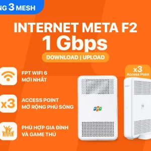 Gói Cước META F2 FPT là gói cước mới được ra mắt khách hàng vào ngày 1/1/2025. Với việc thay đổi tốc độ X3 nhưng vẫn giữ nguyên giá cước đây sẽ là một gói cước cực kỳ hấp dẫn dành cho các cá nhân, hộ gia đình có nhu cầu sử dụng đường truyền Internet WiFi Gia Đình tốc độ cao. 1000 Mbps là tốc độ mà gói cước META F2 sở hữu kèm theo là thiết bị Modem WiFi 6 mới nhất giúp cho việc phủ sóng và phát sóng trở nên mạnh mẽ hơn các dòng Modem đời cũ.
